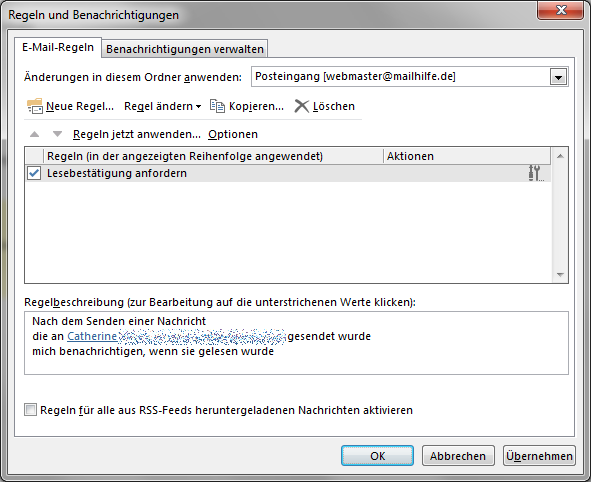 Die Einrichtung einer selektiven Anforderung von Lesebestätigungen kann über eine Benachrichtigungsregel erreicht werden.