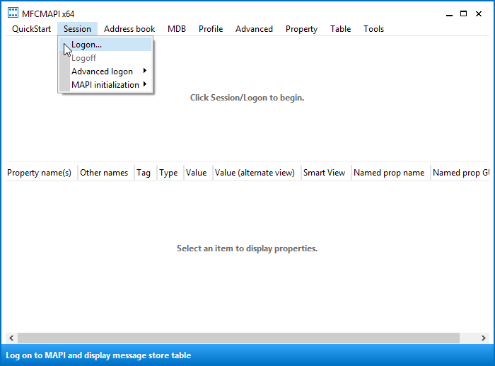 2. Akzeptieren Sie alle Dialogaufforderungen um zum Hauptfenster von MFCMAPI zu gelangen.