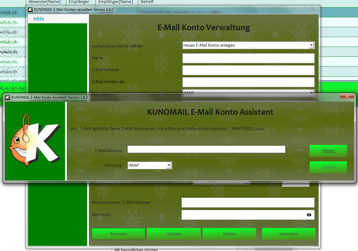 Anlegen eines E-Mail Kontos in KuNoMail mit Hilfe des Assistenten. bitte anklicken für eine größere Ansicht