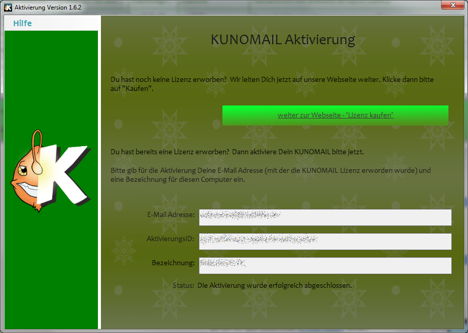 - in KUNOMAIL über „Hilfe“ – „KUNOMAIL aktivieren„