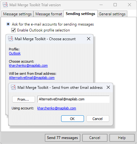 Bisher konnten Sie vor dem Versenden von Nachrichten eines der konfigurierten Outlook-Konten auswählen, das verwendet werden soll. Ab der Version 6.0 des Mail Merge Toolkits können Sie nun auch E-Mails als eine andere Person versenden, wenn Sie über die Berechtigung „Senden als“ oder „Im Namen eines anderen Postfachs“ verfügen. Diese Funktion funktioniert mit Exchange-Postfächern und ist in der Professional Edition verfügbar.