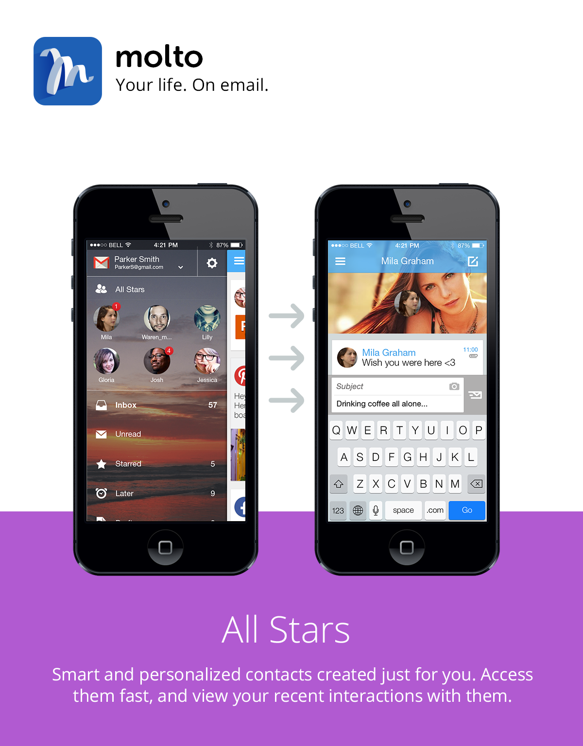 Molto war sehr ähnlich wie Incredimail aufgemacht, die Nachrichten wurden dargstellt als würde man eine Zeitschrift aufschlagen dabei wurde der Focus auf mediale Inhalte wie Fotos und Kontaktbilder gestellt.