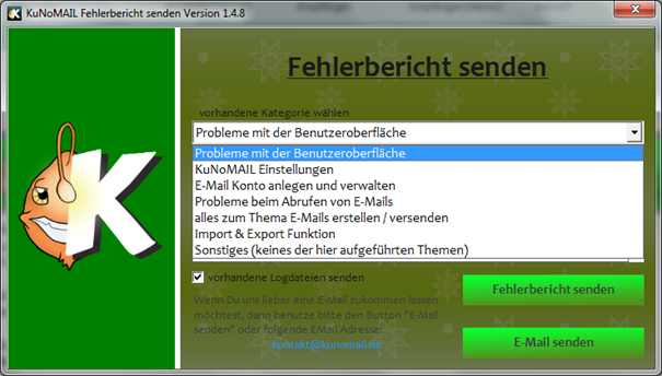 Wenn Sie ein Problem haben können Sie bei der Vollversion von KuNoMail Ihr Problem über das Menü Hilfe->Fehlerbericht senden.
