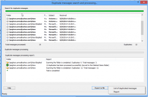 Nach der Suche wird auch angeboten die Ergebnisse in eine Textdatei zu exportieren: Sie können sich entweder den Bericht anschauen (wenn das Programm Fehler erkannt hat) oder nur die Liste der verarbeiteten Emails überfliegen.