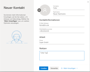 Fügen Sie den Vornamen, Nachnamen, die E-Mail-Adresse, die Handynummer, den Firmennamen und ggf. Notizen hinzu.