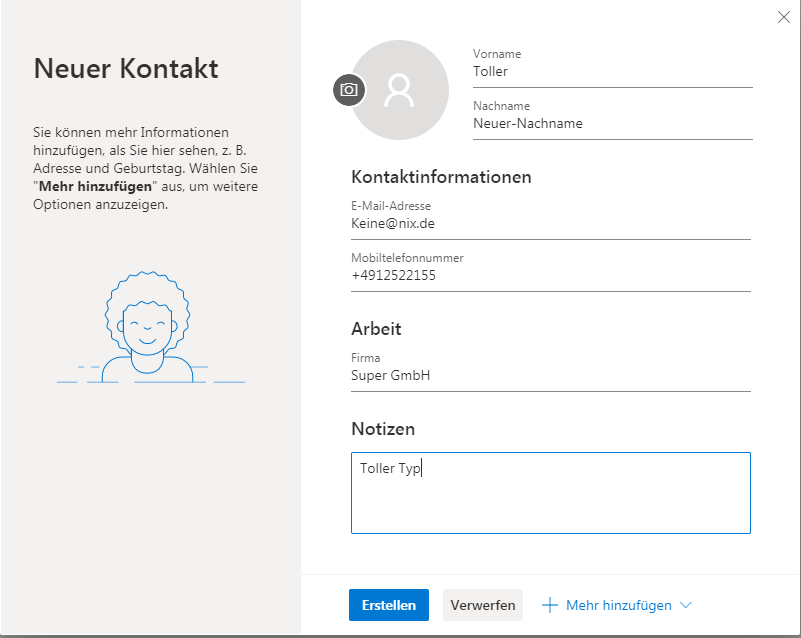 Klicken Sie auf Mehr hinzufügen, um weitere Telefonnummern, Adressen, Geburtstag, Jubiläum usw. hinzuzufügen, und klicken Sie dann auf Erstellen.