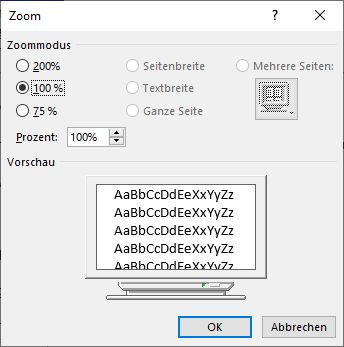 Beim Lesen von Mails im Lesebereich lässt sich der Zoom-Level ebenfalls anpassen. Nutzen Sie dafür die Kombination Strg + Scroll oder verschieben Sie den Zoom-Regler in der unteren rechten Ecke. Ein Klick auf die Zoom-Prozentzahl öffnet ein Dialogfenster, in dem Sie den Zoom-Level ändern können.
