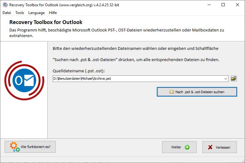 Ich habe Dich jetzt über die Sicherheit der Anwendung aufgeklärt. Es gab noch keinen geschilderten Fall, wo durch diese Anwendung persönliche Daten gestohlen worden sind. Recovery Toolbox for Outlook ist ein kleines Programm auf Deinem PC, welches sich nicht mit externen Seiten verbindet. Der Zugang ist jedoch einfacher als Du denkst. Die Entwickler wissen, dass Du ihre Anleitungen liest, nachdem der Schaden angerichtet worden ist. Hier kannst Du also nicht mehr viel falsch machen. Öffne das Programm und starte es. Bevor Du die Recovery Toolbox (Postfach Wiederherstellungstool) startest, solltest Du auch noch Deine PST-Datei von Outlook auf einer anderen Festplatte speichern. Zwar verändert Recovery Toolbox for Outlook (Postfach Wiederherstellungstool) die ursprüngliche Datei nicht, wir gehen somit aber auf Nummer sicher. Wir fertigen zuerst eine Kopie der wichtigen Datei an und checken zweitens die Integrität der Festplatte. Ist das nicht einfach? Sollte das versuchte Kopieren der PST-Datei in einer Windows-Fehlermeldung enden, hast Du mein Beileid. Das Problem ist schlimmer als erwartet. Jetzt muss man das ganze System wieder richtig herstellen. Und das ist ein ganz anderes Kapitel.