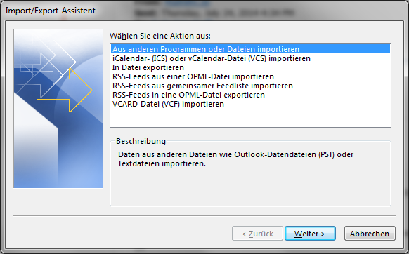 Datei-> Öffnen und Exportieren-> Importieren/Exportieren