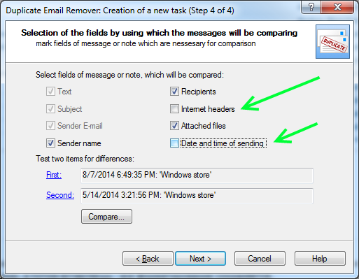 Es ist wichtig, dass Sie den Haken aus den Kästchen entfernen, in denen die Unterschiede gefunden wurden. Das wird dem Programm sagen, dass diese Felder ignoriert werden sollen wenn das Programm die Nachrichten vergleicht, um Duplikate zu entdecken.